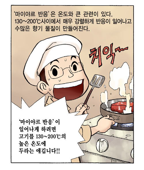 고기는 단백질과 글리코겐 이라는 당 성분을 함께 갖고 있어 마이야르화 되기 가장 좋은 음식 중 하나 입니다.
