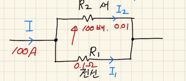 참새가 받는 전류 -> I2 = I x (R1/R1+R2) = 100 x (0.1/(0.1+100)) = 0.0999A